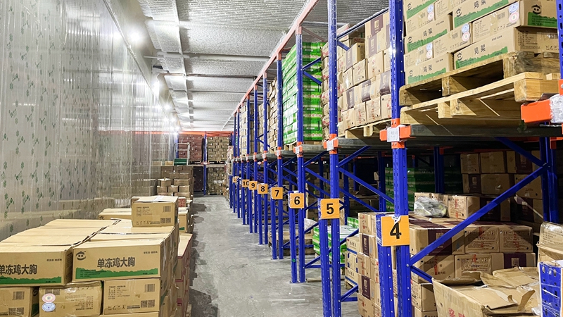 一扇扇厚重的冷庫(kù)大門前,4℃、-18.2℃、-24.1℃……各顯示屏上精準(zhǔn)顯示著門內(nèi)各自的溫度。打開門,白色冷霧縹緲,儲(chǔ)物架上一箱箱凍品標(biāo)簽明顯、排列整齊。走近了聞,是干爽冷冽的涼氣,沒有一點(diǎn)異味?!拔覀兊睦鋷?kù)在區(qū)域內(nèi)行業(yè)領(lǐng)先?!敝T暨分公司倉(cāng)儲(chǔ)部負(fù)責(zé)人邊晨升自豪地說(shuō)。2022年,諸暨分公司新建冷藏冷凍庫(kù)5500立方米,并搭配智能監(jiān)控與移動(dòng)端操作系統(tǒng),進(jìn)一步提升了公司倉(cāng)儲(chǔ)條件,實(shí)現(xiàn)了凍禽、水產(chǎn)、蔬菜等的專倉(cāng)儲(chǔ)存,有效避免串味與不當(dāng)儲(chǔ)存造成的損耗問題。冷庫(kù)還專門設(shè)置了轉(zhuǎn)運(yùn)倉(cāng),可以臨時(shí)存放即將運(yùn)出的貨品,做好全程冷鏈的銜接。